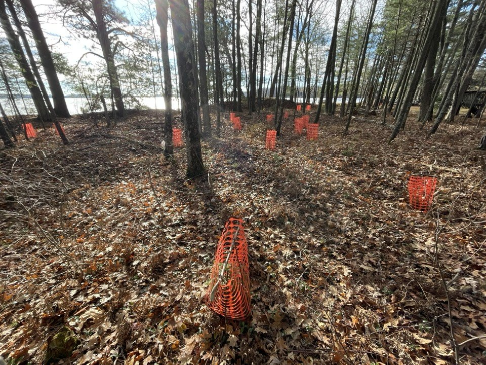 NOVEMBER 15, 2025 – As the rest of the world turned in earnest, I worked (earnestly) in my own little corner of it, continuing the annual fall project I started yesterday: installing protective fences around hemlock saplings and stapling paper “bud caps” on the terminal shoots of the young white pine, all in the woods …